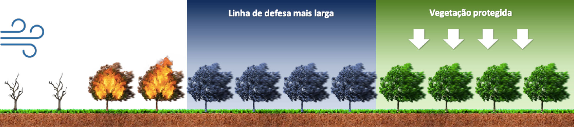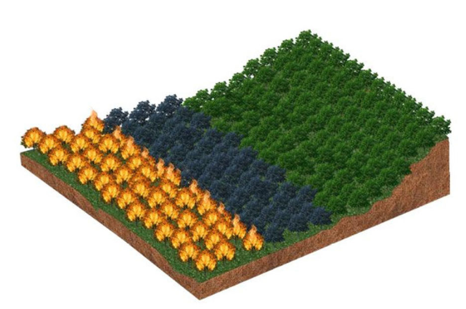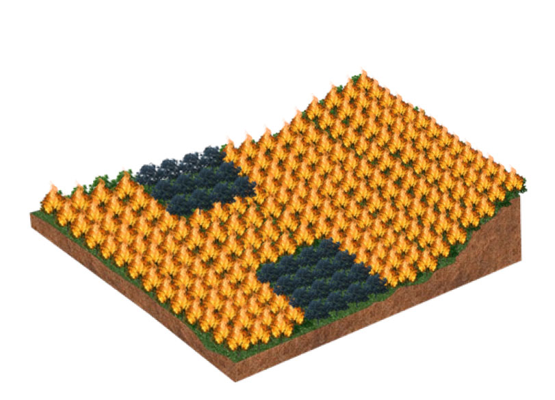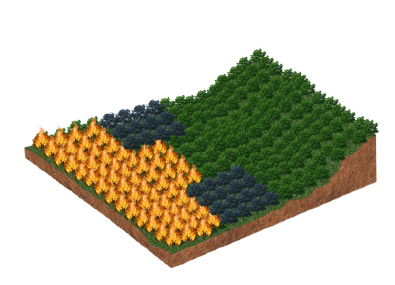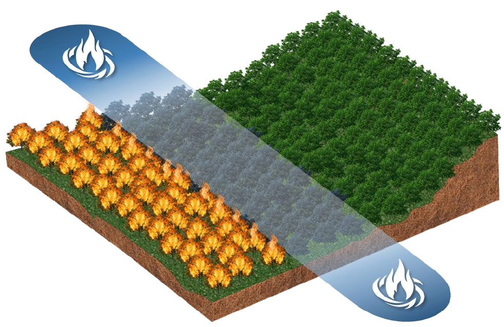 O Fertil Fire® aplicado com falhas (imagem 1) cria uma faixa de defesa parcial (imagem 2), que permitirá o avanço das chamas e a propagação do incêndio (imagem 3), que atingirá toda a área da floresta (imagem 4), preservando somente os locais onde o produto tiver sido efetivamente aplicado (imagem 5).
