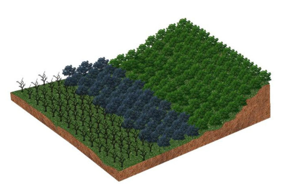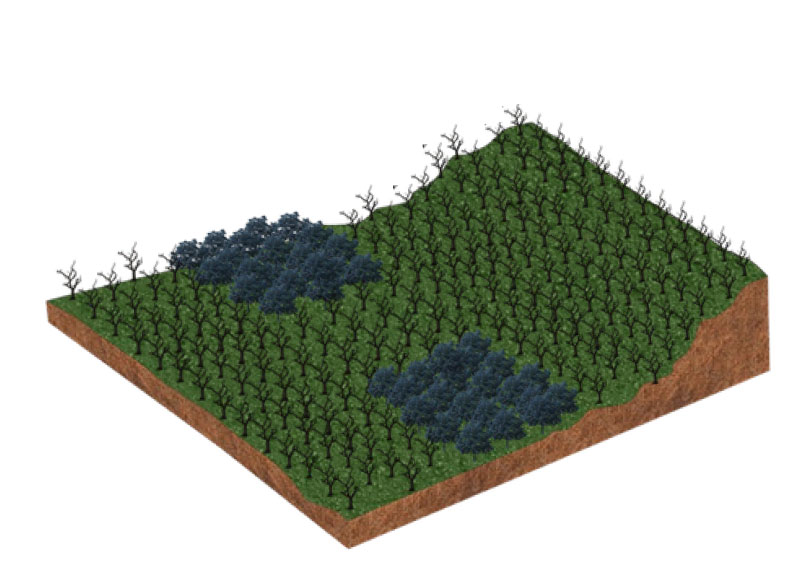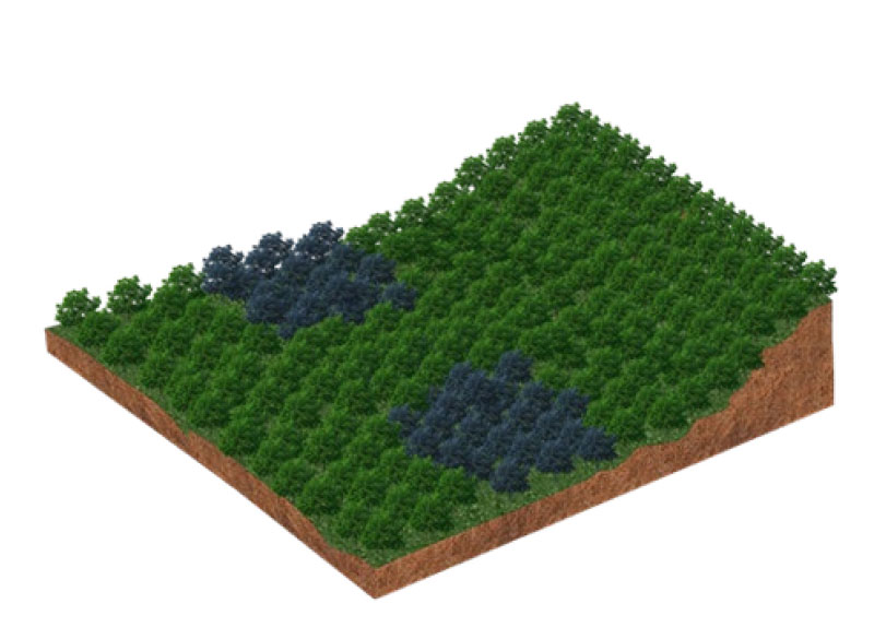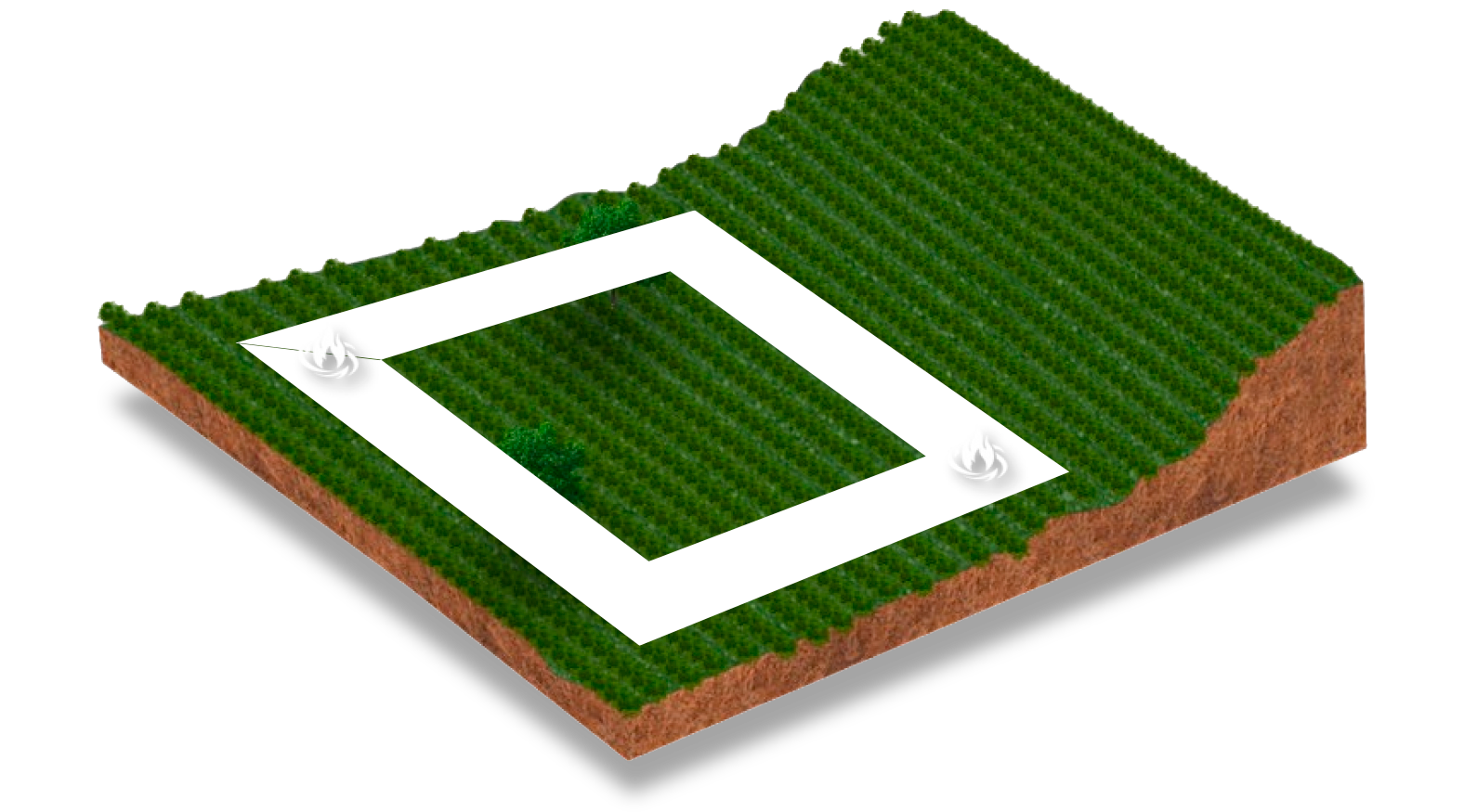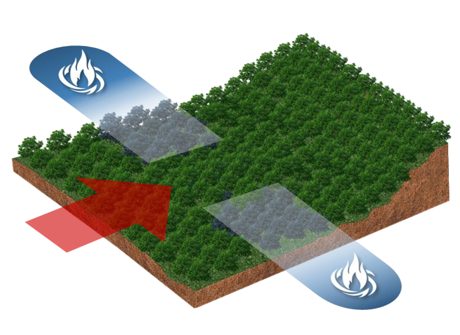 O Fertil Fire® aplicado com falhas (imagem 1) cria uma faixa de defesa parcial (imagem 2), que permitirá o avanço das chamas e a propagação do incêndio (imagem 3), que atingirá toda a área da floresta (imagem 4), preservando somente os locais onde o produto tiver sido efetivamente aplicado (imagem 5).