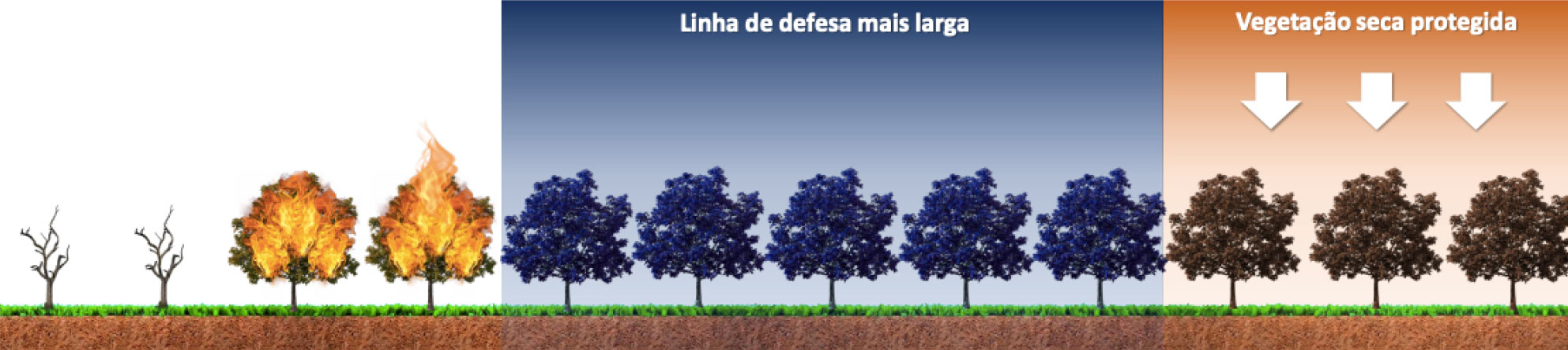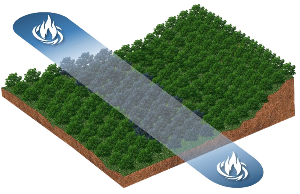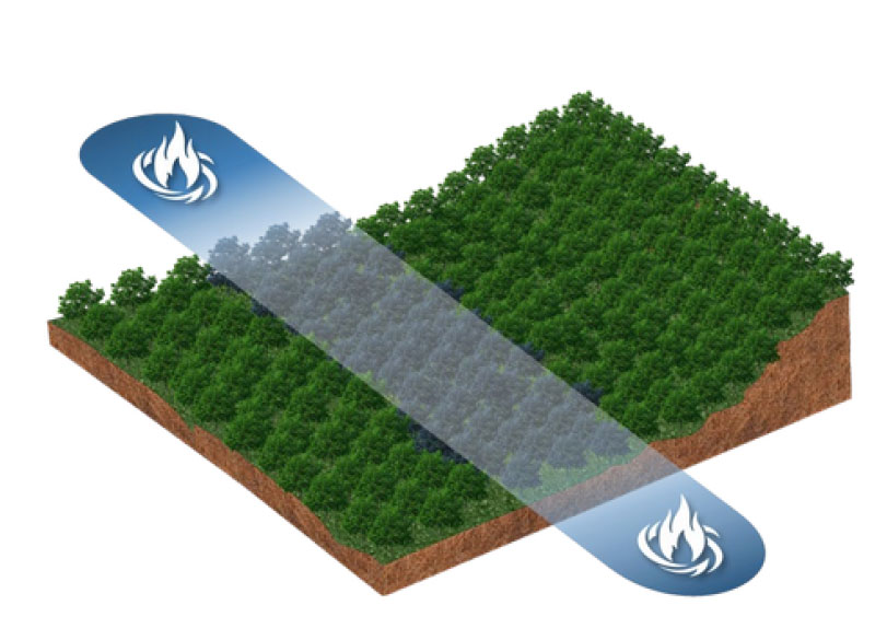 O Fertil Fire® corretamente aplicado (imagem 1) cria uma faixa de defesa segura (imagem 2), que garantirá a não propagação do incêndio, através de sua ação extintora, tamponante e refrigerante (imagem 3), preservando o restante da floresta de maneira eficaz (imagem 4).