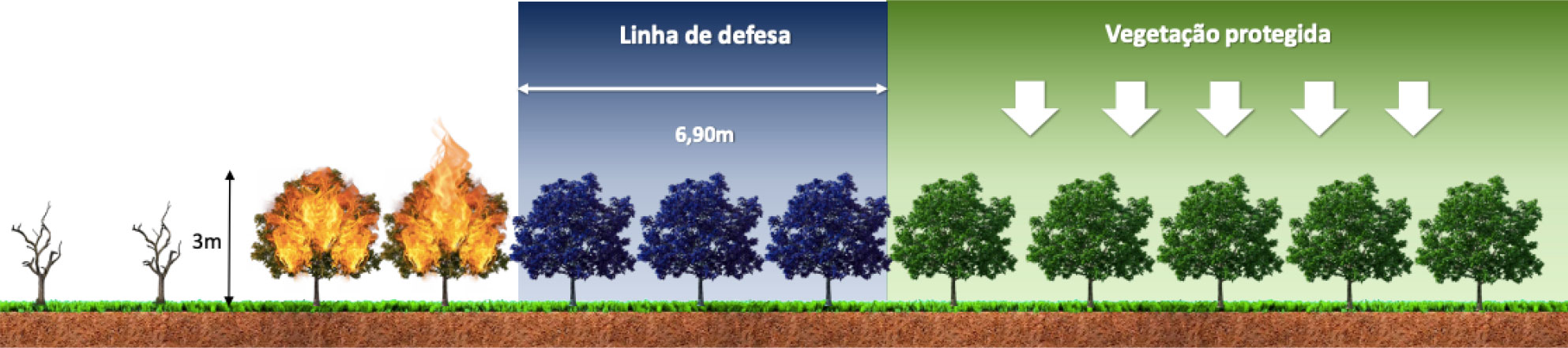 A largura da linha de defesa deverá ser equivalente a 230% da altura máxima da vegetação.