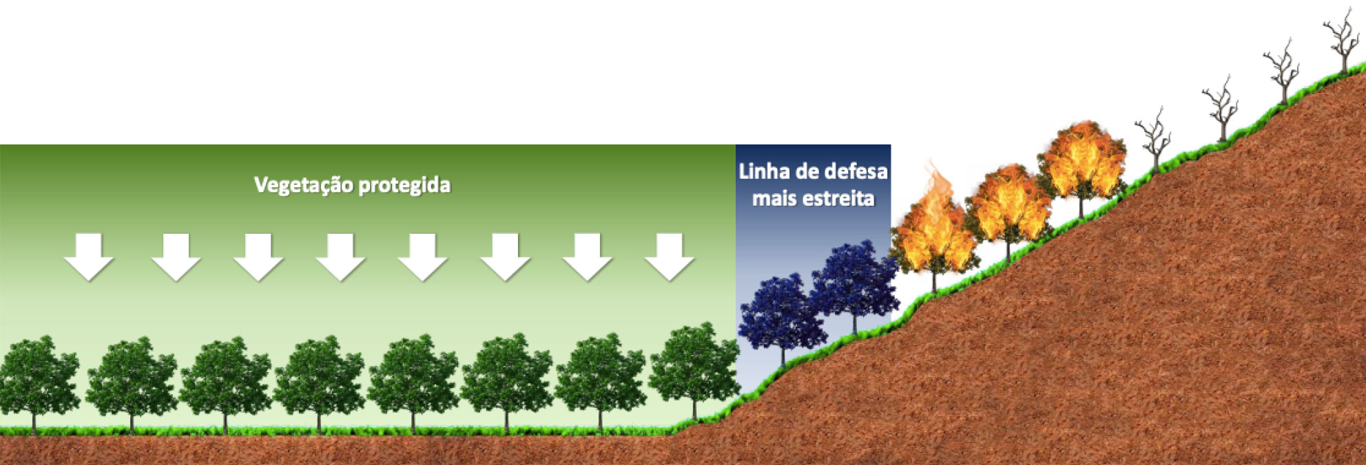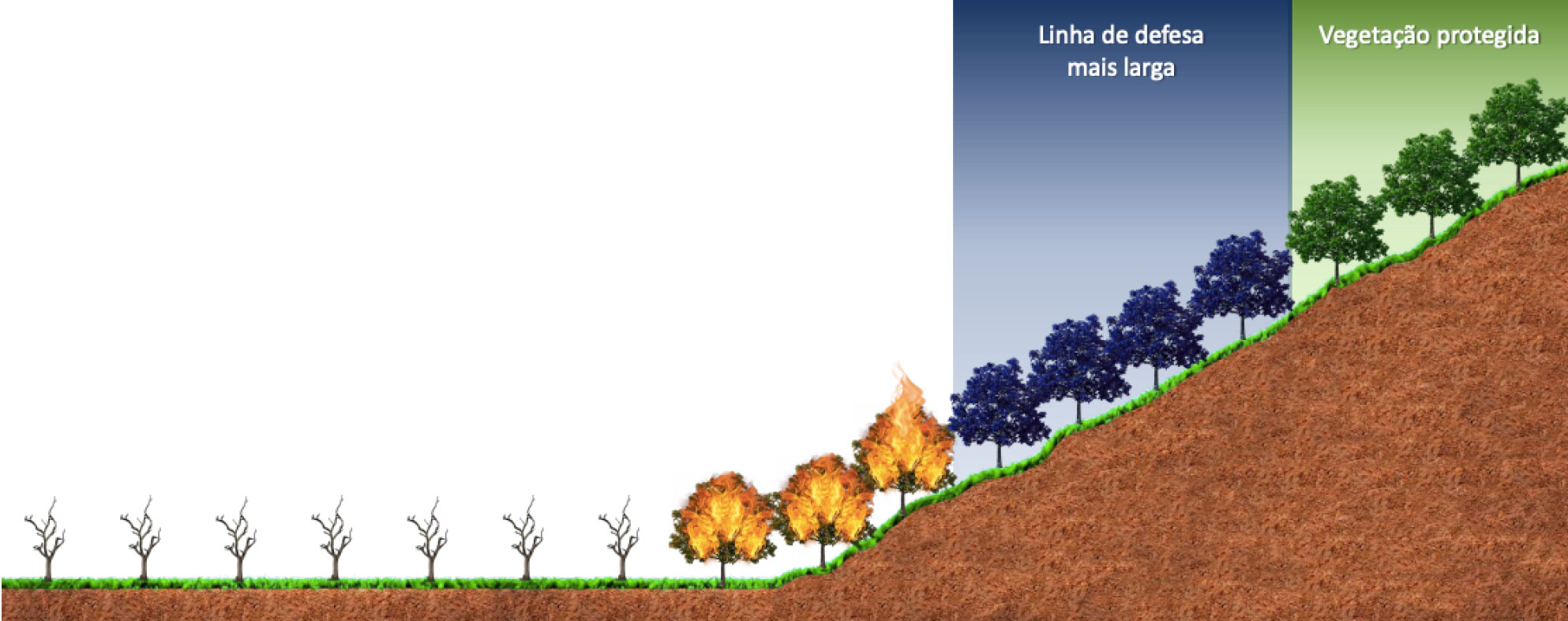 Em áreas de aclive e fogo morro acima, a solução deverá ser aplicada em maior quantidade, com formação de linha de defesa mais larga do que em áreas planas ou com aclive e fogo morro abaixo
